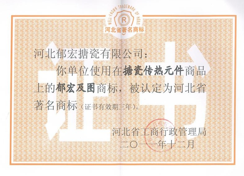 2011年12月我公司在搪瓷傳熱元件商品上的郁宏及圖商標(biāo)獲得河北省工商行政管理局頒發(fā)的河北省著名商標(biāo)證書。